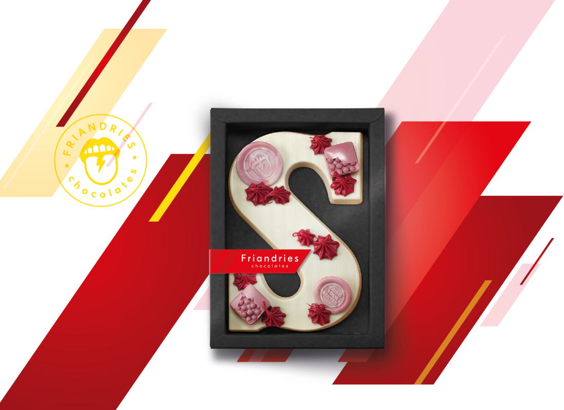 De Zephyr witte chocoladeletter is ambachtelijk bereid in ons chocolade-atelier in Tilburg. Op de letter zit een garnering van ruby chocolade en ruby crisp.